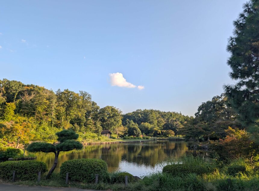 中池の西側を進む。ちょっとした芝生広場にベンチ・テーブル、木々の間を抜ける遊歩道。のんびりするのも、歩くのも気分次第。