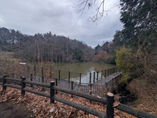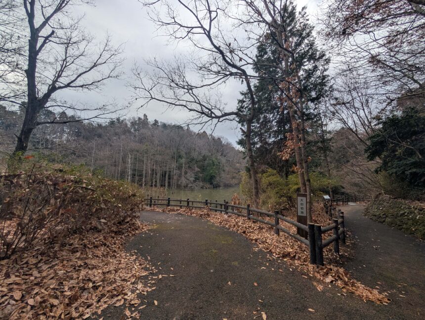 今回は公園内を散歩。階段を下りて右にトイレと広場、広場の先には「大田切池」がある。