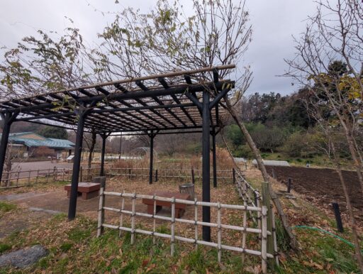 パークセンター(写真左奥)が見えて来る。周りは里山風で畑やパーゴラがある。ここで右に曲がってパークセンターを左に見ながら進むと、スロープと階段を通って尾根緑道やドッグランに直行できる。