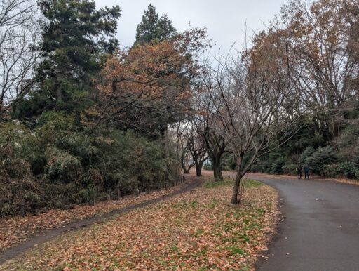 トイレ付近に戻ってから、パークセンターの方へ進む。舗装されてて真っすぐ広い道は歩き易いし、両側の大量の枯葉を踏んで歩くこともできる。(せっかく掃除されてるから、散らかさないようにしよな)