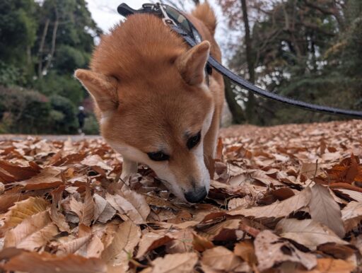 ジロウは今日も落ち葉ソムリエとして、真剣に「利き落ち葉」に取り組む。