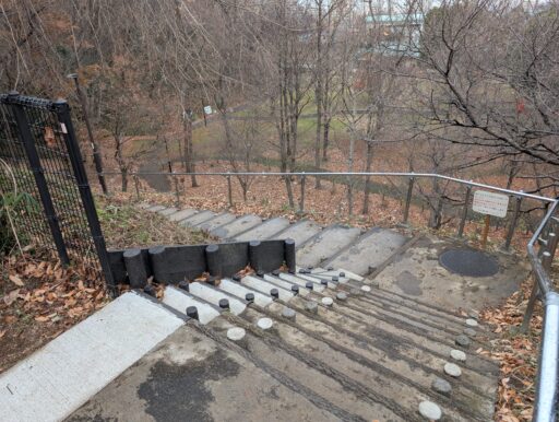 パークセンターに下りる方の階段はこんな感じ。当然だけど、パークセンターからドッグランに直行しようとすると、この階段を上がることになる。(写真奥の方にパークセンターの青っぽい屋根が見える)