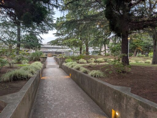 駐車場からの出口は2ヶ所。1F出口から出て歩道を少し歩いて公園に入るか(写真)、駐車場内のエレベーターで駐車場の上にある「世界の広場」に出るか。「世界の広場」からは階段かスロープで下りることもできる。
