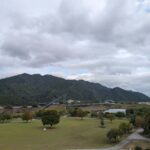 しばらくブロック舗装、途中からアスファルト舗装の道を進む。緩やかな下り坂をのんびり。右奥に緑色のネットで囲まれた野球場が見えてくる。
