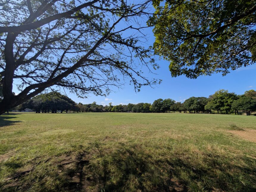 原っぱの周りは木に囲まれてて、その外側を舗装された歩道が一周してる。(写真だと左の木々の奥が原っぱ)