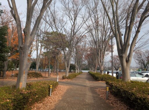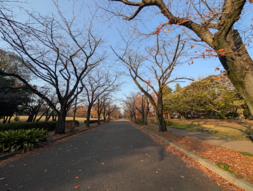 公園の北にある「正門」から、南寄りにある「花の広場」までまっすぐ延びる「花のプロムナード」 季節によっては何か花が咲くのか、と思って調べたら桜並木らしい。