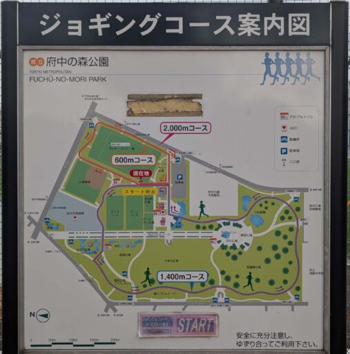 ジョギングコースの案内図を発見。こういう案内たまにあるけど、コースごとの距離がワンコ散歩でも参考になる。今日は「1,400mコース」で行こうと思いつつ、次々と気になる方に曲がって行く未来が視える。(結局参考にしないんか)