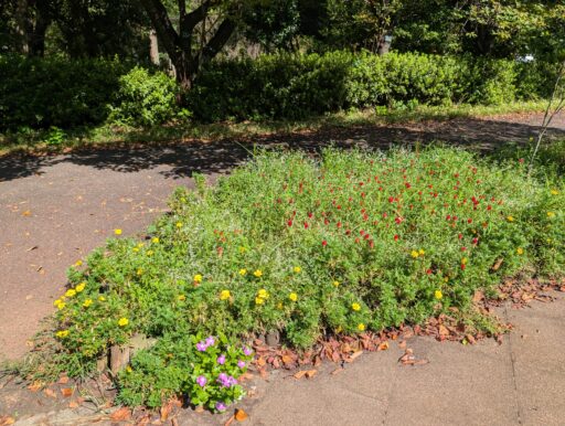 植えられた草花と自然の草花が混然一体となった、たぶん花壇。狙い通りなのか、そうでないかはわからないけど、こういう感じ結構好き。