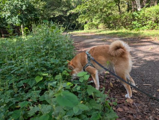 もう、頭突っ込んで好きなだけ臭い嗅いじゃう。うちの近くにはない臭いなのかな。気になる臭いが多すぎて、なかなか進まん。なんなら、進んでもまた戻って同じところ嗅ぎ直したり。