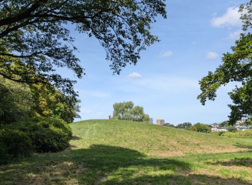 くじら山から見た「はらっぱ」で、奥には野川。緩やかな起伏があるけど、起伏を避けて歩くこともできる。