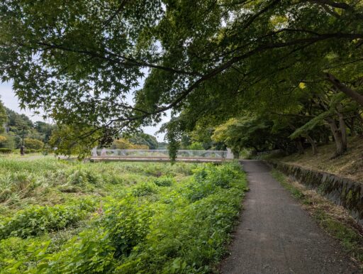 「はらっぱ」から野川沿いの砂利道に。夏草で隠れてるけど、左側に野川が流れてる。道を覆うようにカエデがずっと生えていて、秋のとてもキレイな紅葉が想像できる。たまに枝が折れて垂れてたりするから、ワンコや地面だけでなく、前にも注意して歩こう。