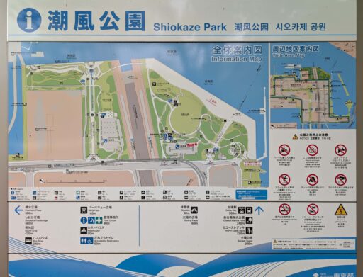 首都高と湾岸道路を挟んで南北2つのエリアがあって、それぞれに第一駐車場(北)と第二駐車場(南)がある。南北の行き来は海沿いの潮風橋(歩行者用スロープ)か、駐車場入口がある道路沿いの歩道のどちらか。