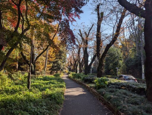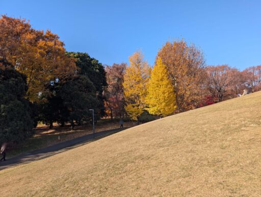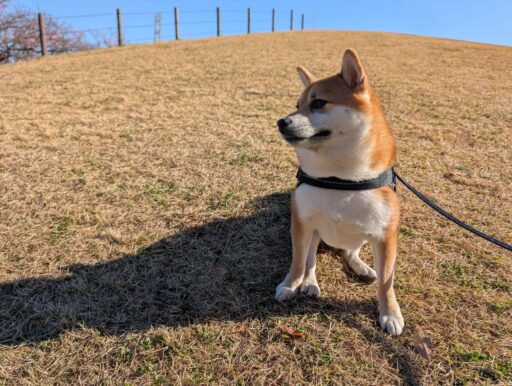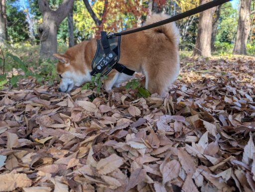 広場周辺の道はアスファルト舗装でほぼ平坦だけど、芝生や土の部分は緩やかな起伏がある。ジロウは枯葉を踏んで歩くのが好きだから、道じゃないところを歩く。シャクシャク、シャクシャク・・