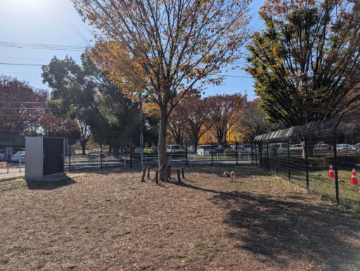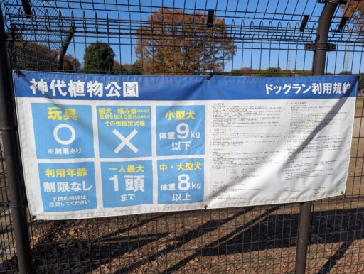 都立公園のドッグランは、どこもこの形式で公園ごとのルールが記載されてるぽい。ジロウは8.5kgくらいで、公園によっては小型犬エリア以外禁止だったりするけど、ここではどっちも選べて良かった。小型犬エリアだと、周りのコが小さくてドキドキしてしまう。