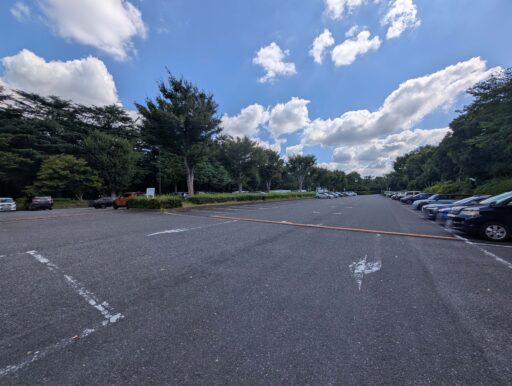 駐車場は広々として停めやすい。クルマが向かい合う駐車枠だけど、よく見ると向かい合う真ん中にも駐車枠。混雑以外はあまり使われてないけど、乗り降りし易いからか積極的に真ん中に停める人も見掛ける。