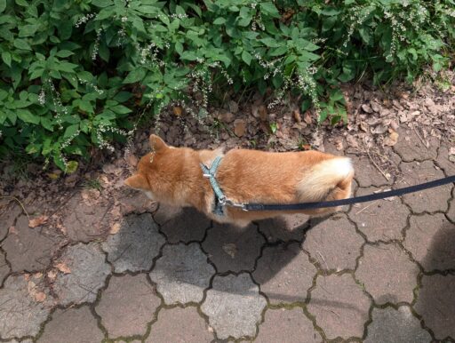 ハーネスは「柴犬と言えば唐草模様でしょう」という飼い主の安易な買い物により。今度、風呂敷も買おうかね。