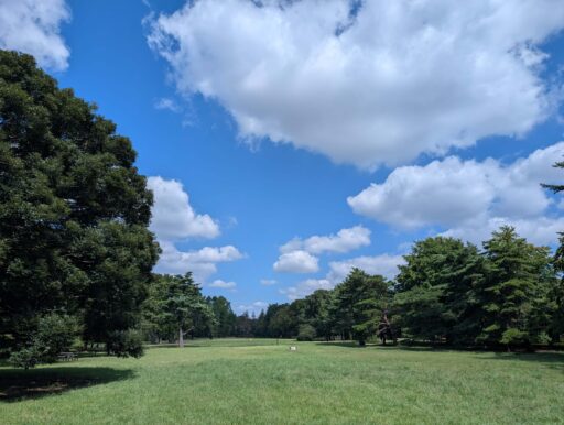 暑くなければ、広い芝生広場で走り回ったりボール遊びするのも楽しい。9月だけどまだ夏の雲。