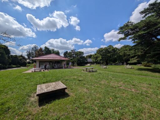 サービスセンター近くには売店「パークス野川」があって、周りの芝生にテーブルもいくつか。