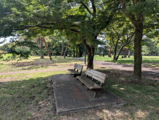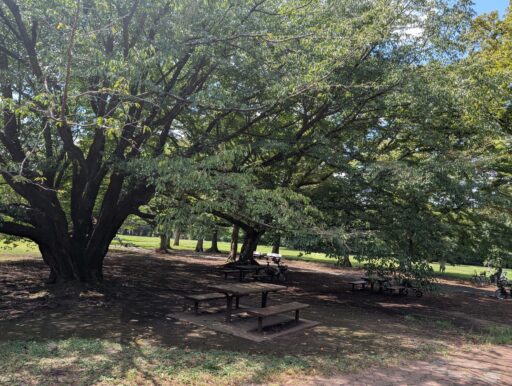ベンチやテーブルが所々にあるけど、木の下の良い感じの場所にも結構あって休憩や食事に良さそう。