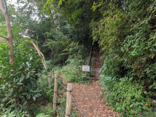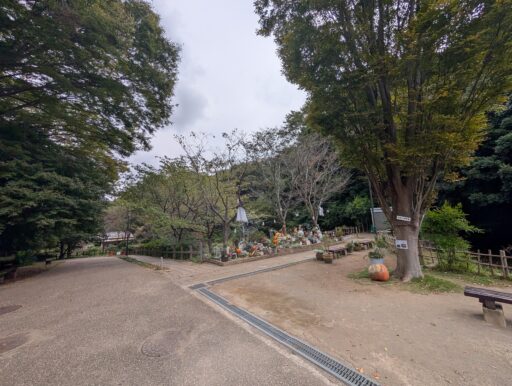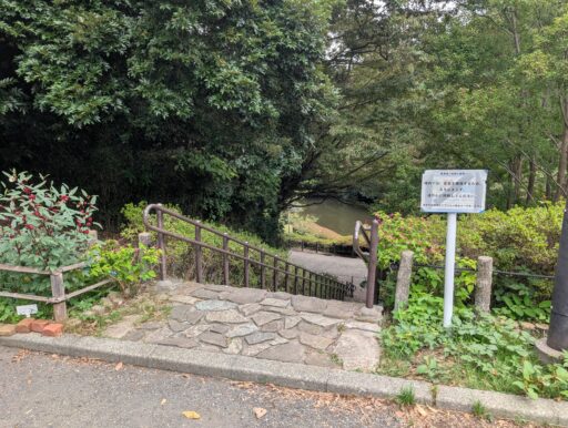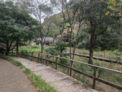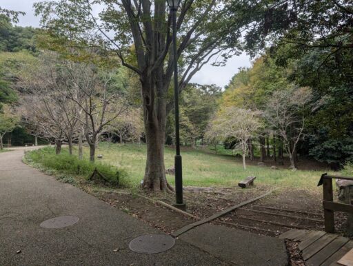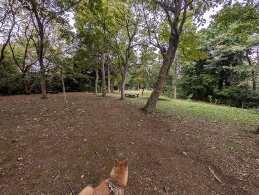休憩所のすぐ近くにある恐らく「疎林広場」に繋がる道。ここを通ればたぶんぐるっとできるけど、狭くて急でワンコ散歩には向かないように見えた。また、園内の散策路には何ヶ所か門があって、公園全体より開放時間が短いらしい。朝夕はちょっと注意かな。