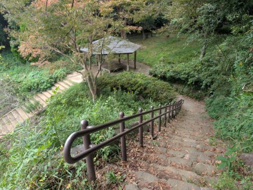 更に下っていくと、左側に「庭園植物園」が見えて来る。奥の階段を上ると東屋があって、庭園を見下ろしながら休憩できる。階段を避けて坂も最小限にするなら素通りで。