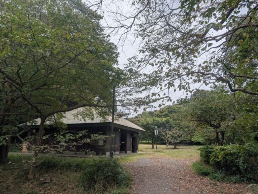 「農家風休憩所」に到着。その奥に見えるのが「野外生活体験広場」。広場には所々木が生えていて、ベンチ・テーブルで休憩することができる。周りに人がいなければ走ったり遊んでも良さそう。