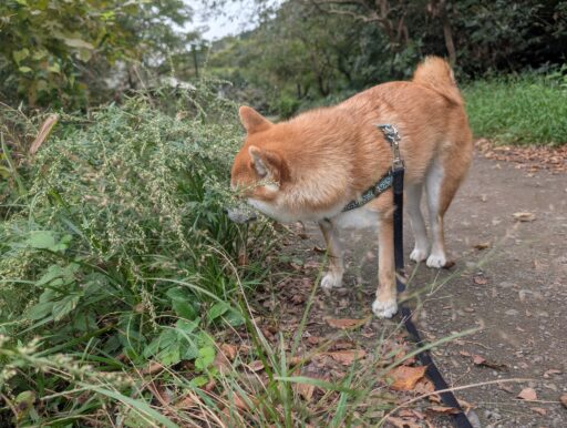 庭園植物園奥の東屋から更に上るやや急な階段があって、そこから東屋の周りをぐるっと歩くことができる。階段と細い坂を通るから、ワンコと飼い主の体調に合わせてって感じかな。これまでの整備された園内と違って、ちょっとした登山道。登って何かある訳でもないから、そのつもりで登ろう。