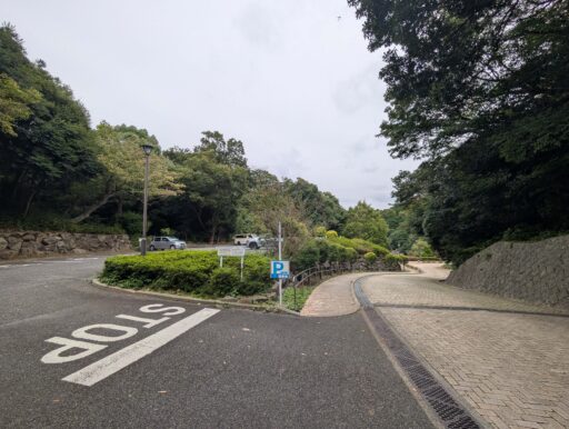公道から公園に入って下って行くと左に駐車場がある。階段を避けるなら、クルマを停めて車道脇の歩道(写真中央)を下って行くと芝生広場。