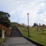 駐車場の奥にある階段をまっすぐ下りても芝生広場に行ける。それ程長くないけど、表面が石組みだから、ワンコによっては少し通りにくいかもしれない。